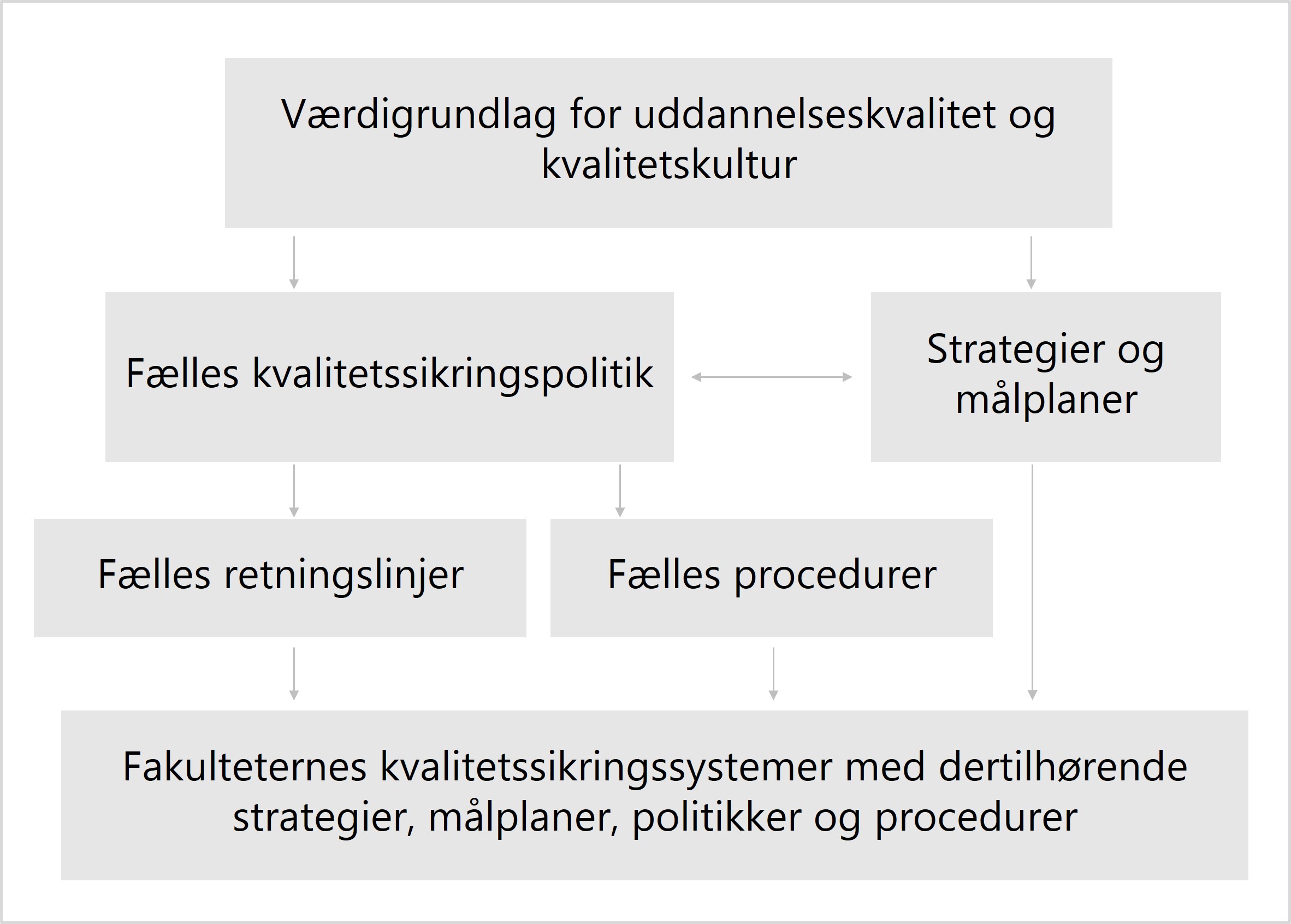 Kvalitetssikringssystemet bygger på sammenhængende kvalitetstænkning og solidt forankret ledelsesansvar. Kvalitetssikringssystemet består af en række dokumenter, der er ordnet hierarkisk i forhold til hinanden.